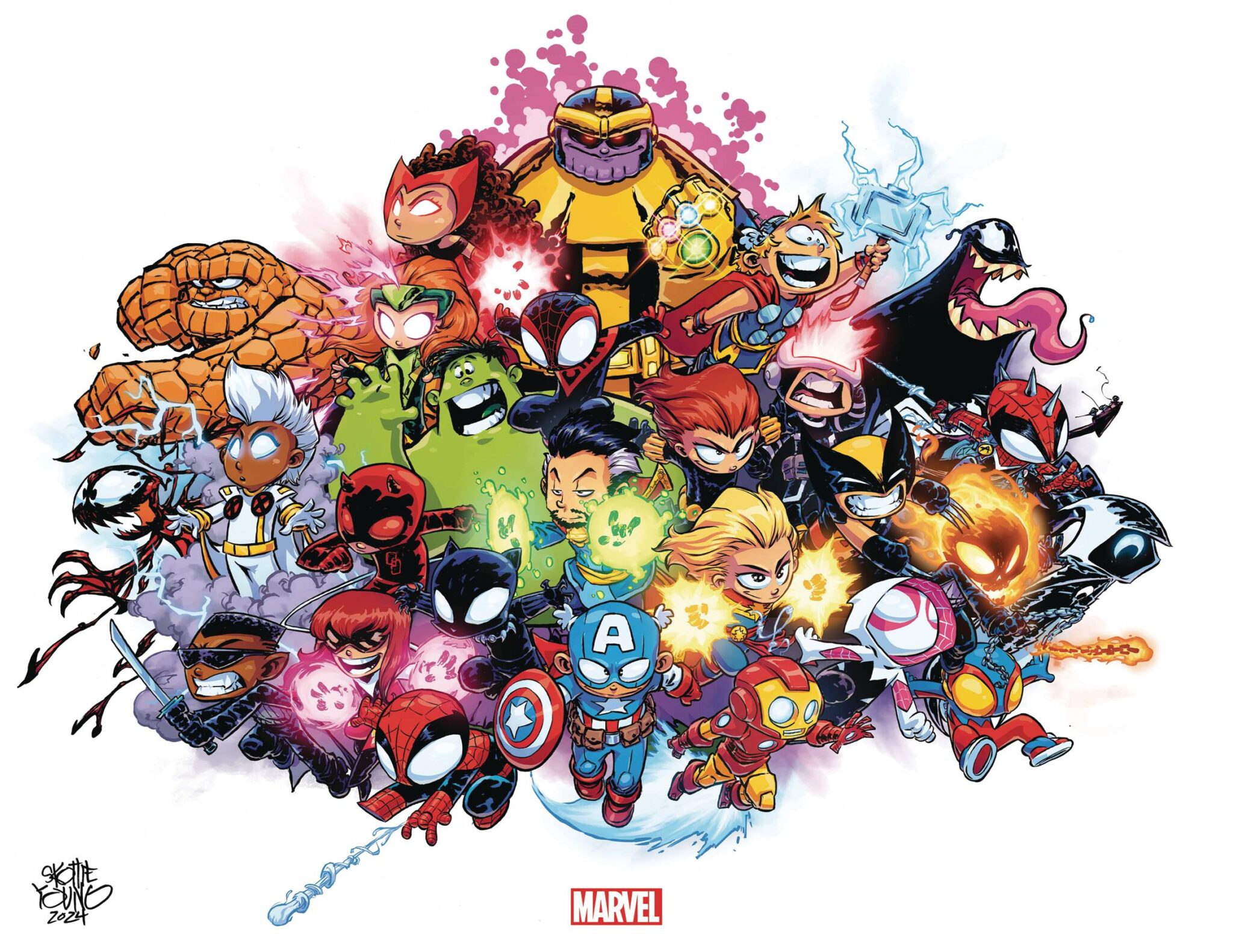 New York, NY— March 27, 2024 — For over 20 years, comic readers have witnessed Skottie Young’s extraordinary vision of the Marvel Universe across covers, interior art, merchandise, and more. This year, Marvel proudly spotlights this Eisner award-winning artist’s legacy with a new cover program that will double as a must-have poster, SKOTTIE YOUNG’S BIG MARVEL VARIANT COVERS, as well as the print debut of Young’s GIANT-SIZE LITTLE MARVELS infinity comic.