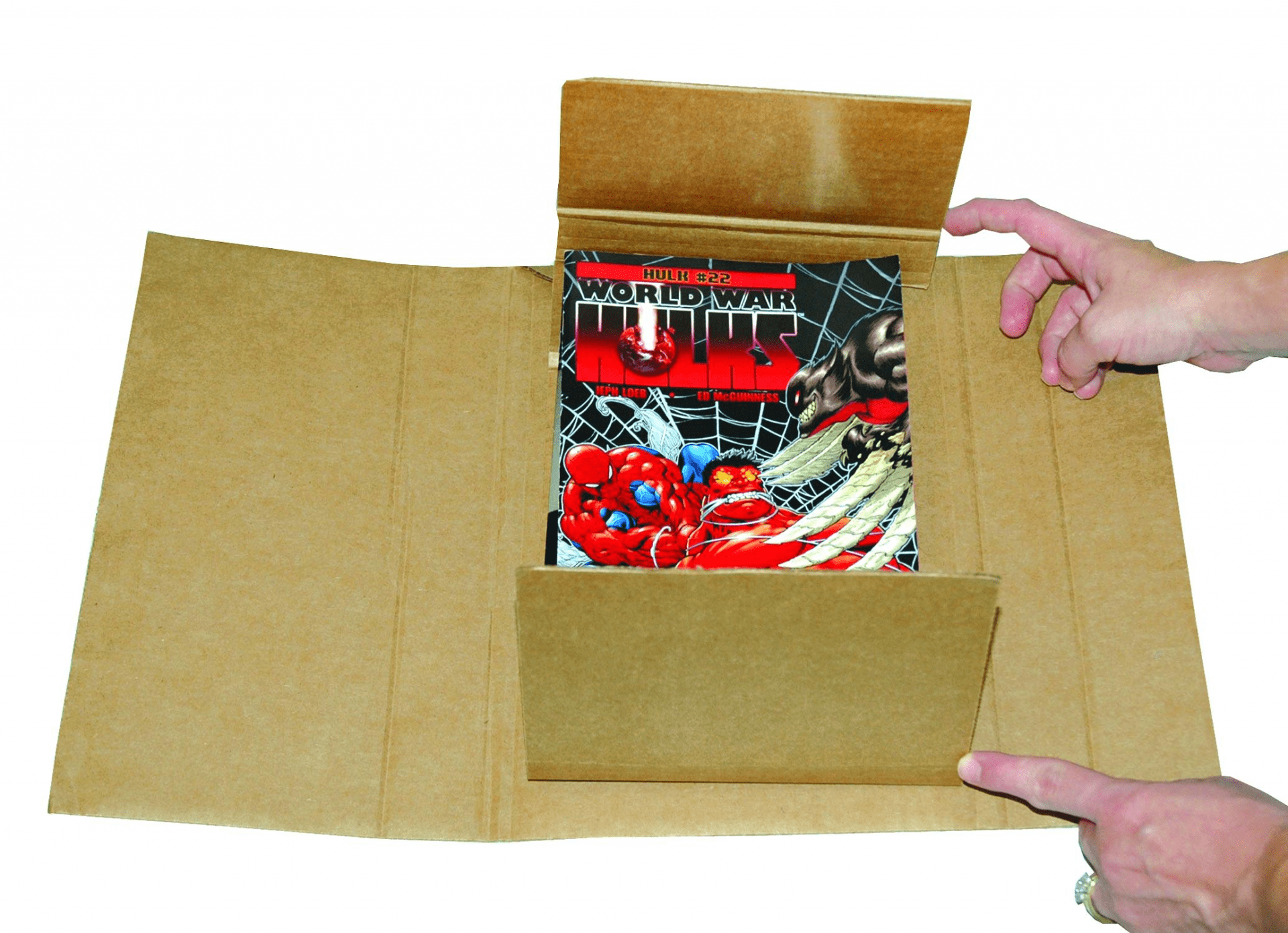 All comic books are bagged and boarded and placed in these specially made comic book T-folder shippers for lightweight but durable shipping of comics and graphic novels. Graphic novels and hardcovers are bagged only before shipping. T-folder shippers can comfortably ship 10-12 regular sized bagged and boarded comics. Anything over 12 comics will ship in larger boxes with secure padding for all corners. Customers choosing Priority Mail Flat Rate shipping will have double box protection (if ordering 12 comics or less) as we pack comics in a T-folder and then inside the Priority Mail Flat Rate box.