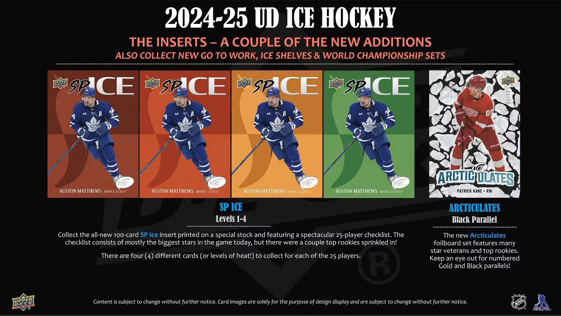 New! Collect the all-new 100-card SP Ice insert printed on a special stock and featuring a spectacular 25-player checklist. The checklist consists of mostly the biggest stars in the game today, but there were a couple top rookies sprinkled in. There are four (4) different cards (or levels of heat!) to collect for each of the 25 players.