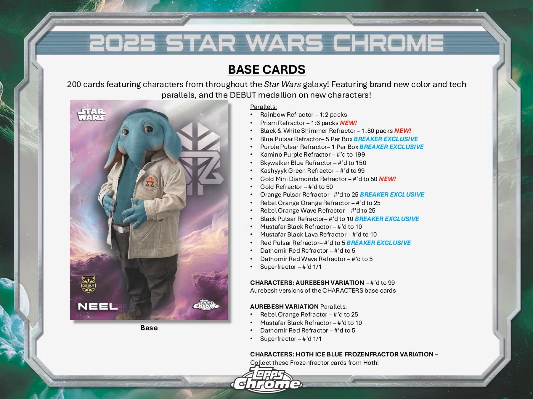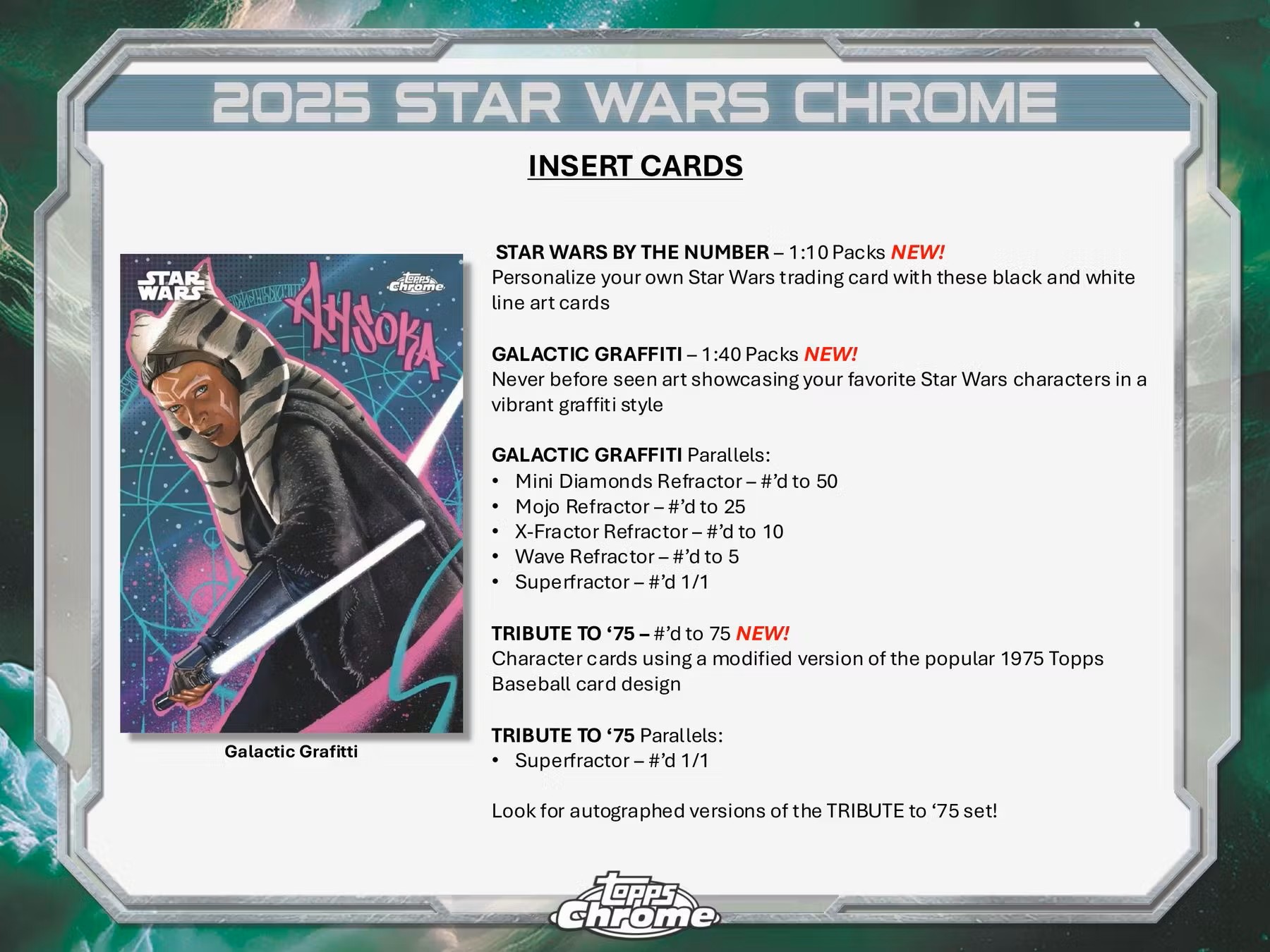 2025 Star Wars Chrome returns for another round with all your favorite characters from across the galaxy in brand new Chrome tech. Star Wars Chrome will include new parallels, exciting inserts, and new signers!