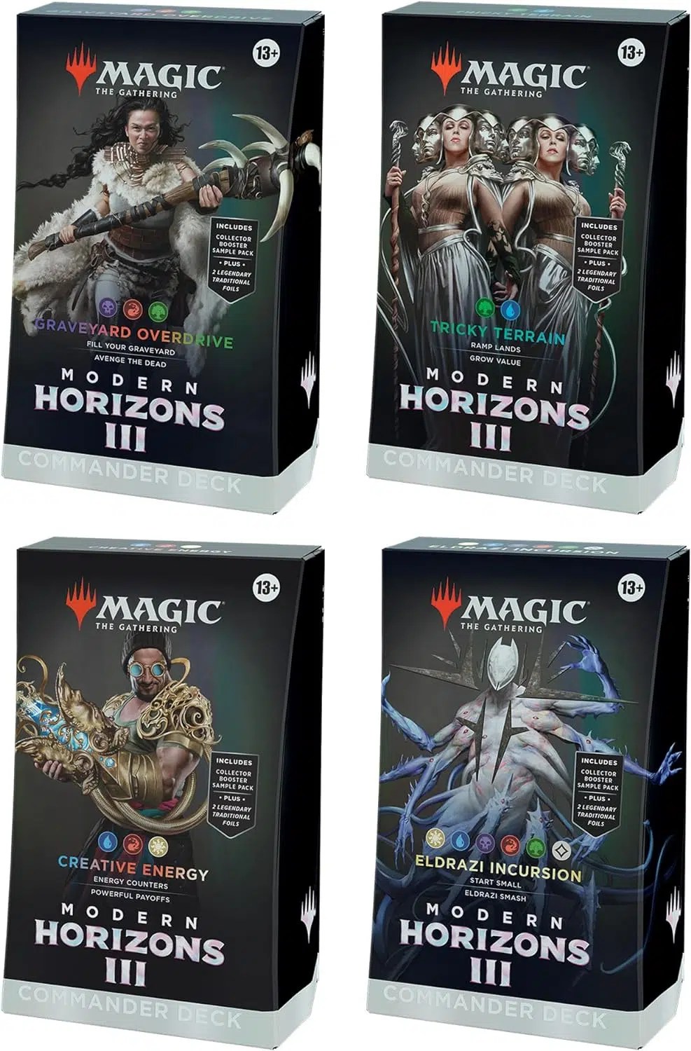 GET ALL 4 MODERN HORIZONS 3 DECKS—Fill your graveyard and avenge the dead with Graveyard Overdrive, ramp lands and grow value with Tricky Terrain, use energy counters for powerful payoffs with Creative Energy, or unleash Eldrazi to devour all in your path with Eldrazi Incursion
