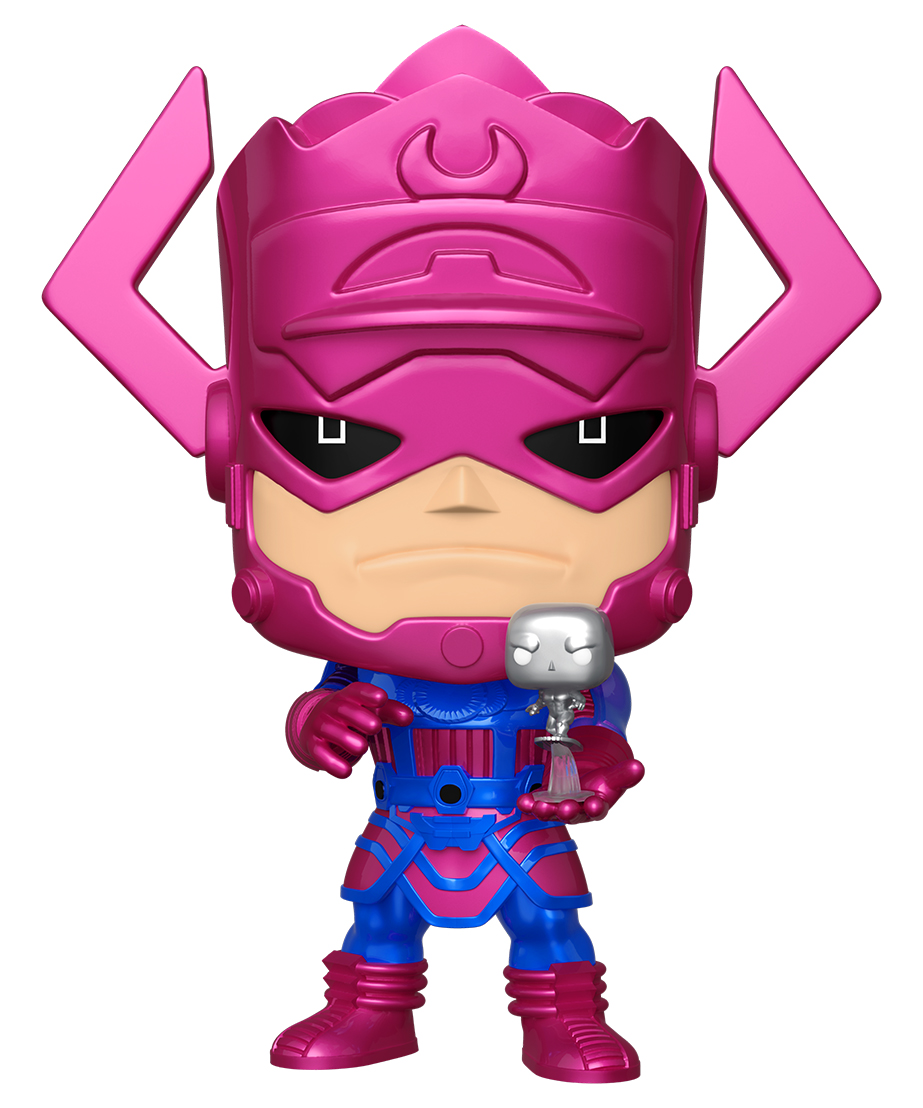 From Funko. A PREVIEWS Exclusive!Galactus and the Silver Surfer are ready to devour some planets in this Jumbo-sized PREVIEWS Exclusive Pop! Vinyl figure! Featuring classic square pupils, pink helmet and purple armor, the classic Galactus and his herald are sure to loom over your collection, consuming planets at will. Featuring a metallic paint job, this 10″ tall Pop! Figure comes packaged in a window box, perfect for display. This PREVIEWS Exclusive Pop! Figure is limited to 20,000 Pieces, so order now and don’t miss adding this massive cosmic entity to your collection!