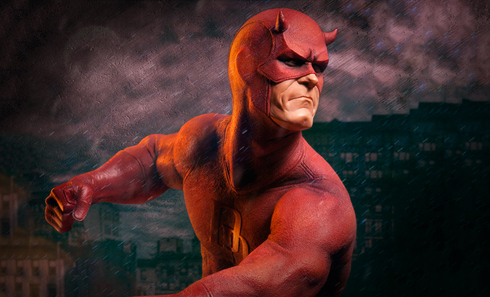 From Marvel Comics, Sideshow Collectibles is proud to present the Daredevil Premium Format™ Figure. By day Matt Murdock is a successful criminal attorney, but by night, he guards the neighborhood of Hell’s Kitchen in New York City as the masked vigilante, Daredevil! With heightened senses, the Man Without Fear charges past the broken ruins of a Lady Justice statue and into the night to combat the injustice he cannot tackle in the courtroom. The sleek and muscular hero is disguised in his fantastically sculpted iconic red costume with raised ‘DD’ logo and fabric details, wearing an expression of intense concentration under his distinctive horned mask. Skilled in combat and armed with his signature billy club weapon, Daredevil will do whatever it takes to protect and defend the innocent. The Daredevil Premium Format™ Figure is an outstanding addition to any collection, perfect for any Marvel display.