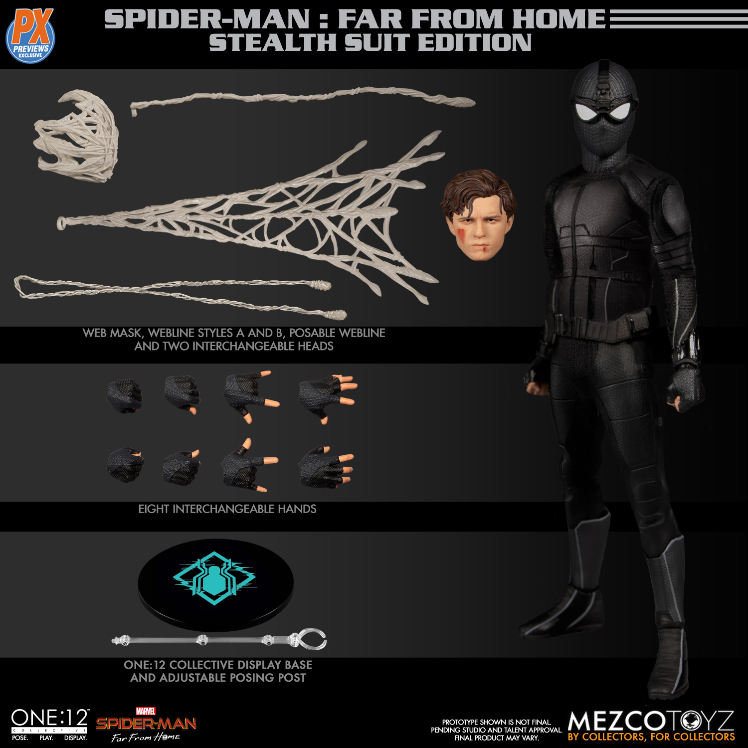 From Mezco Toys. A PREVIEWS Exclusive! As seen in the movie, Spider-Man: Far From Home,Peter Parker returns for a summer trip to Europe, but trouble follows with a series of attacks that are creating havoc across the continent! This exclusive figure features a detailed masked head sculpt that features removable eye pieces, along with an alternate head based on the likeness of actor Tom Holland, so fans can recreate all their favorite scenes. Also included are: eight interchangeable hands, web mask, and a variety of spider-web shooting effect parts including a poseable webline! Each PREVIEWS Exclusive One:12 Collective Spider-Man: Far From Home Stealth Suit figure comes with a display base and adjustable posing post, and comes packaged in a deluxe, collector friendly box.