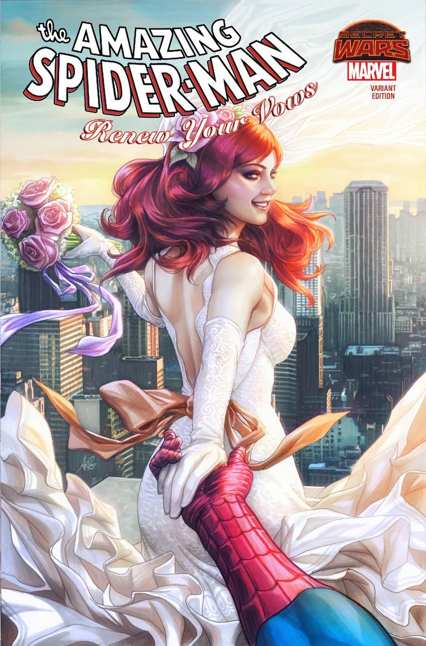 Our next Legacy Edition Exclusive Variant by Stanley “Artgerm” Lau is an homage to the famous photography of Murad Osmann, with Mary Jane leading Spider-Man by the hand on a ledge in New York City.