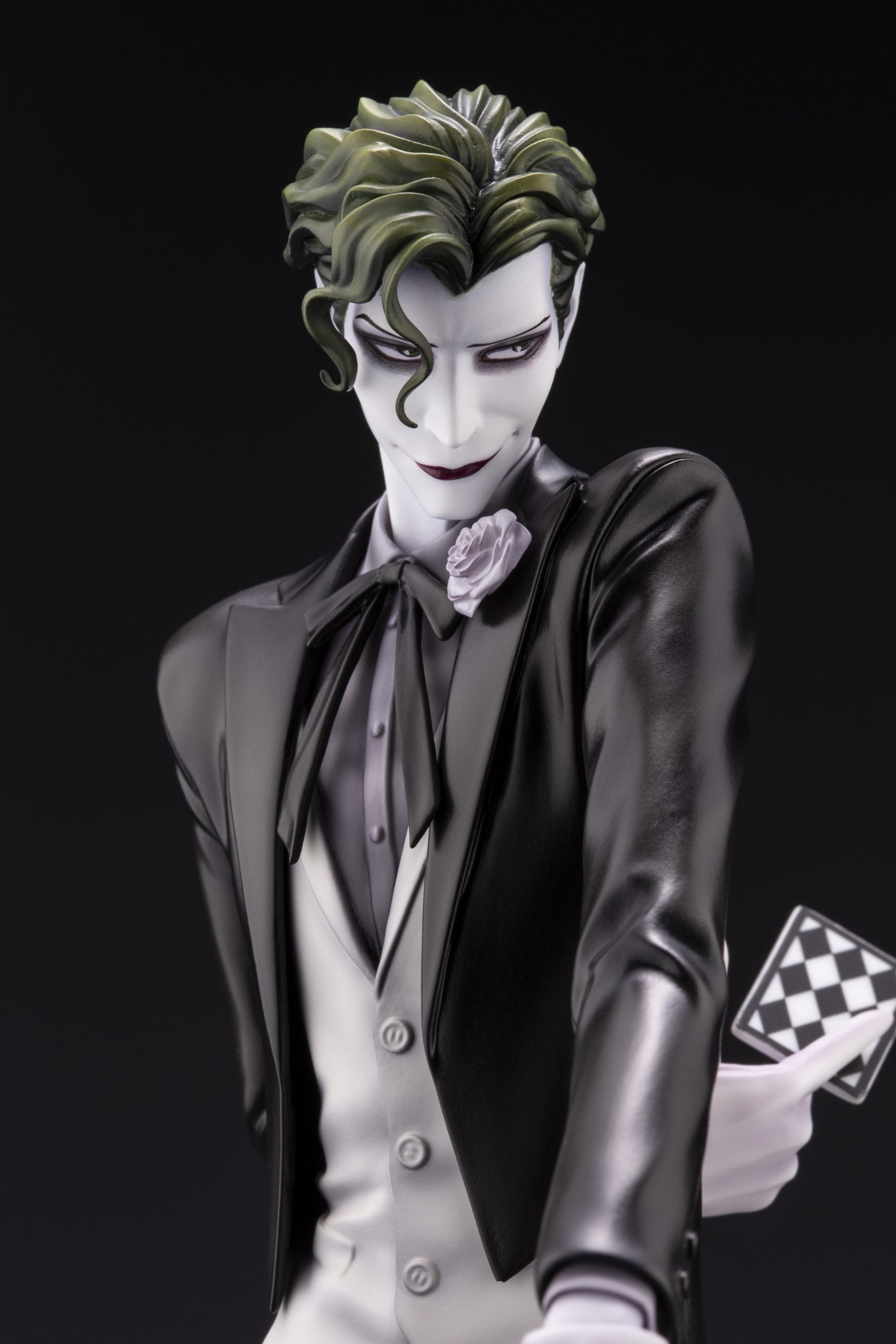 The Joker reappears in this limited edition statue exchanging the trademark purple suit for a chic monochrome color tuxedo. Wearing a mischievous grin and holding a long staff and a joker playing card in each hand, this statue perfectly showcases the measures Joker would take to get the final laugh.