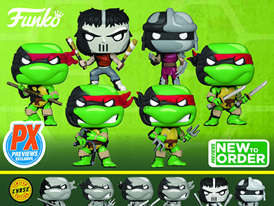 | JUST ANNOUNCED: Funko Pop! Teenage Mutant Ninja Turtles PREVIEWS Exclusive Vinyl Figures with Black and White Chase! Inspired by the now legendary comics phenomenon that took the world by storm, Eastman & Laird’s Teenage Mutant Ninja Turtles are ready to hit your Funko collection “air-borne” with this brand new, PREVIEWS Exclusive series of Pop! figures! The Mirage Turtles come to life in your collection with a comics-inspired cell shaded design! |
